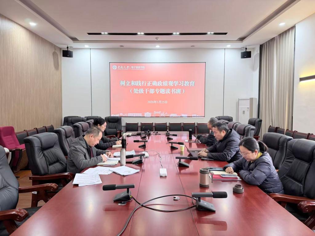 3月25日至4月1日,电子信息学院举办树立和践行正确政绩观学习教育专题读书班,进一步强化理论武装、端正发展理念、提升履职效能。全体班子成员参加学习,党委书记李长庚主持专题学习研讨会并讲话。