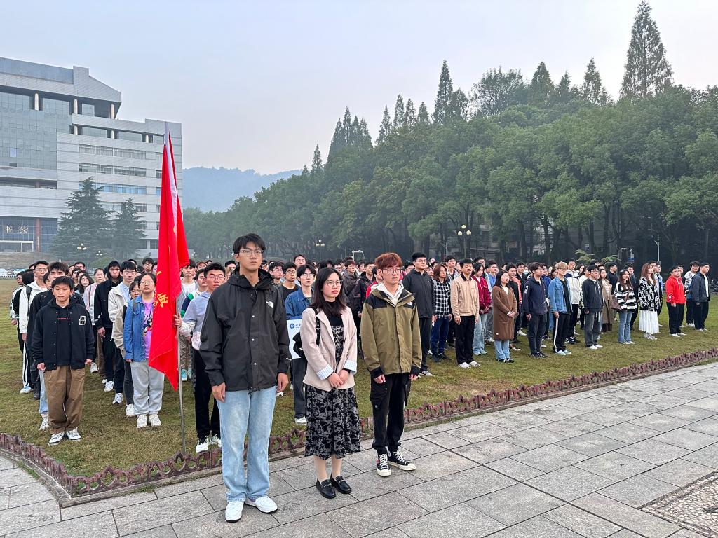 2023年10月30号清晨,中南大学在校本部图书馆前坪举行升旗仪式,本科20级辅导员龙欣琪老师及电子信息学院全体本科生参加本次升旗仪式。