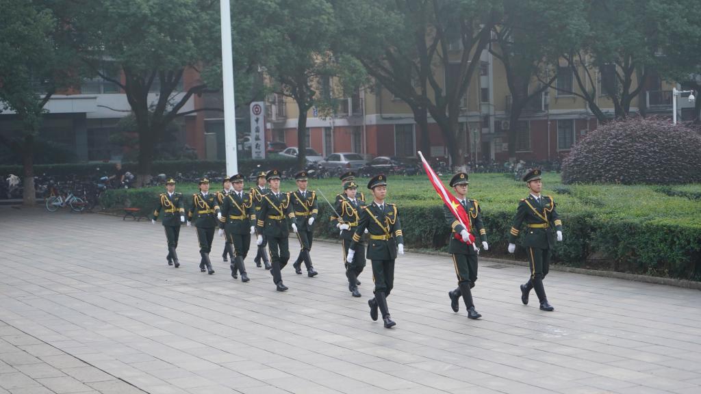 早上6时25分,全场安静下来,国旗班成员迈着矫捷的步伐,护送着鲜艳的五星红旗缓缓走来。随着雄伟庄严国歌奏响,五星红旗冉冉升起,在晨曦中迎风飘扬,全体师生向国旗行注目礼。礼毕,护旗手们迈着整齐的步伐有序退场。