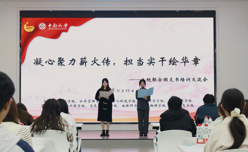 为深入学习贯彻党的二十大精神,落实学校“学科交叉育新人”工作要求,全面加强基层团组织建设,提升团支书的团务能力与协作水平,2025年11月15日上午9时,由人文学院、公共管理学院、冶金与环境学院、生命科学学院、土木工程学院、资源加工与生物工程学院、马克思主义学院、地球科学与信息物理学院、电子信息学院联合举办的“凝心聚力薪火传,担当实干绘华章”九院联合团支书培训交流会在岳麓山校区立德厅顺利举行。土木工程学院团委书记刘昕老师、人文学院团委书记杨紫金老师莅临指导。校团委组织部团员管理中心曾令儒同学、活动管理中心徐逸宸同学,各学院团委组织部负责人以及九个学院2024级和2025级全体本科生团支书共同参加本次会议。会议由陆涵钰、黄蘭同学主持。本次大会聚焦“跨院团组织交流协作”与“团务实操能力提升”,旨在锻造信念坚定、能力突出的基层团干部队伍。