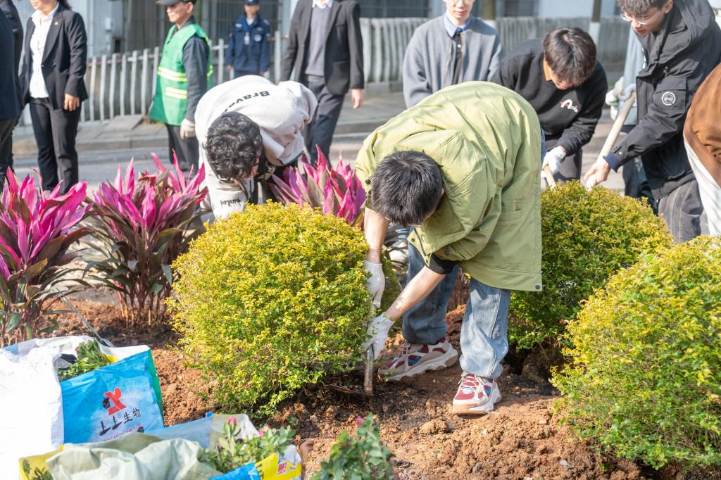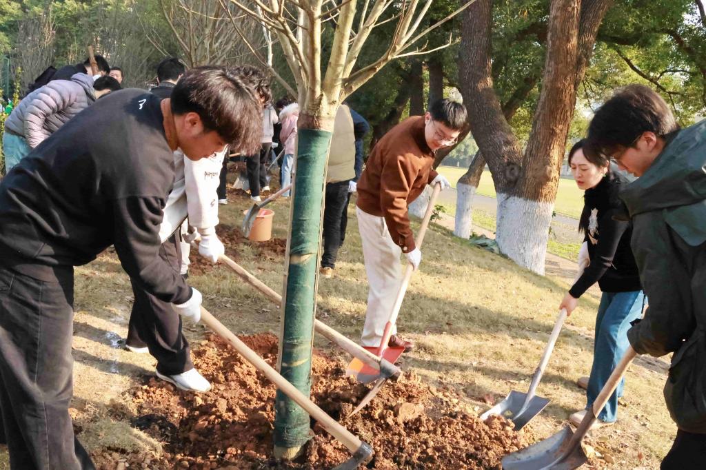 活动现场,大家深受感染,在领取树苗和种植工具后,几人一组挖坑栽苗、培土固根、踩实浇水,配合默契,在后勤保障部工作人员的协助下,学院党委书记李长庚、副书记董晶晶带领学院师生代表种下棵棵玉兰树,共同组成学院“智芯林”。新种下的树苗和“生态花境”在春日里展现出勃勃生机,为天心校区增添了几分绿意。